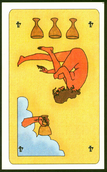 With the 4, the second cycle of this suit is commenced, where a choice between structure and feeling has to be made, where old securities have to be let go of to work towards a new future. But like Wands, Cups don't like structure much, they prefer to be free and dream rather than to make commitments and go for something.