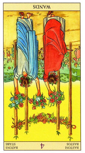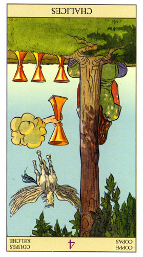 With the 4, the second cycle of this suit is commenced, where a choice between structure and feeling has to be made, where old securities have to be let go of to work towards a new future. But like Wands, Cups don't like structure much, they prefer to be free and dream rather than to make commitments and go for something.