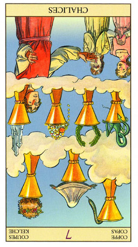 The 7 of Cups is about making a choice between different ideals. But Cups, with the water element, don't like making definitive choices that much, making this 7 in this suit a bit of a hard choice.