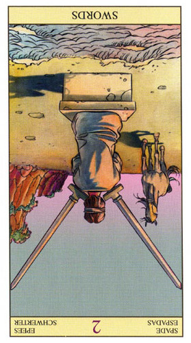 The 2 is an assignment number in tarot, and in this case of the 2 of Swords, it's about being forced to wait for something, often even while blindfolded in some sense.