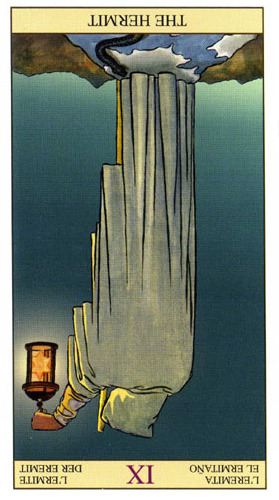 The Hermit shuts out the world and retreats into solitude to better understand some spiritual aspect of life. He opens to the cosmos and lets it's wisdom sink in. Hermits are often seen as wise old men who can guide a traveller along a journey.