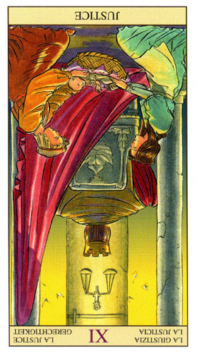 This card carries the number 11. In the Rider-Waite deck, Strength and Justice have swapped places because Waite saw links with the astrological signs Leo and Libra.