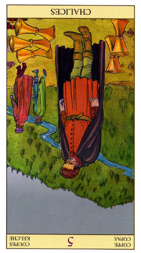 The 5 of Cups is about overcoming sadness and disappointment. You've let go of your old securities to embrace the new and exciting, now something has gone awry and you feel bad about that. But don't forget to notice those things that did go right.