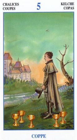 The 5 of Cups is about overcoming sadness and disappointment. You've let go of your old securities to embrace the new and exciting, now something has gone awry and you feel bad about that. But don't forget to notice those things that did go right.