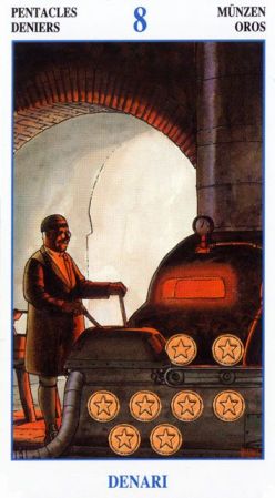 The 8 of Pentacles is about keeping up the hard work you're doing, and trying to be happy about doing that work at the same time. While the 3 of Pentacles is about completing a masterpiece, the 8 of Pentacles is about doing the apprentice work that makes you a master of your trade.