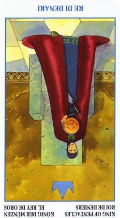 The King of Pentacles uses his Earthly attributes to rule. He goes about his work like an old style business man; he avoids unnecessary risks, aims for real results, and acts from confidence.