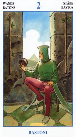 The 2 of Wands represents the research and digestion of a new idea. The number of this card and it's element are somewhat in conflict; while the 2 is focussed inwards, the Wand's element fire is outgoing. Fire wants to steam ahead while the blackbox 2 asks for patience.