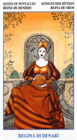 The Queen in the suit of Pentacles becomes aware of her Earthly attributes; she's reliable and sober, able to give good advice.