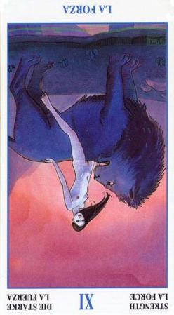 This card carries the number 11. In the Rider-Waite deck, Strength and Justice have swapped places because Waite saw links with the astrological signs Leo and Libra.