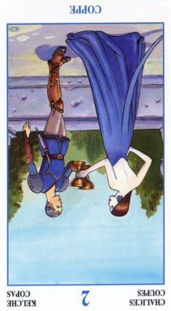 This the first assignment number of the Cups suit. Unlike Wands, with the Fire element, Cups, with the water element, has a lot more patience. Water is by nature more introspective, and this second card in the Cups suit is indeed about exploring yourself. The outcome is uncertain as always, but it usually results in better acceptance of yourself.