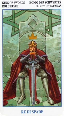 The King of Swords rules with diplomacy and a strong sense of responsibility, not just for himself but also for those around him, yet he is not afraid to make heavy decisions that compel him to eliminate dangers and dangerous opponents with some force.