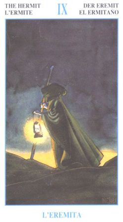 The Hermit carries the number 9. This is the highest base number. After 9 the composed numbers emerge. Therefore the number 9 is the gateway to a higher order. It is also a place to rest before embarking on the next leg of the journey.