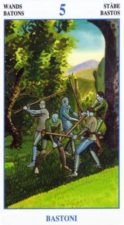 The 5 of Wands represents competition. The 5 is the second assignment number, and therefore a difficult card. 5 combined with the Wand's element fire challenges you. You'll have to fight hard for your idea, but you stand a good chance of succeeding.