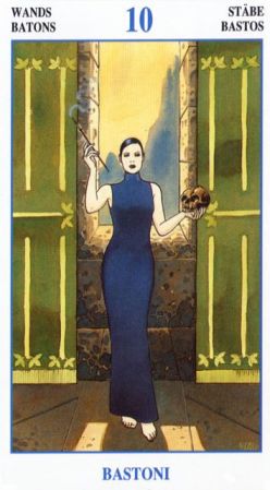The 10 of Wands is therefore the transition from the element Fire (associated with Wands) to the element Water, associated with Cups. As you might imagine, this not the easiest of transitions.