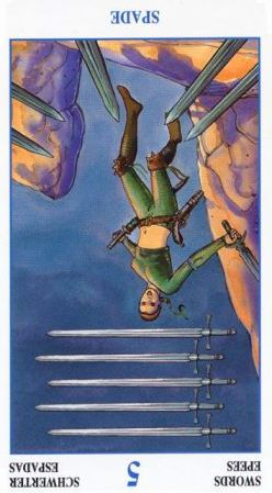 The 5 of Swords is about facing reality. The 5 is an assignment number, and in the slighly more difficult suit of Swords, it means you face a difficult challenge where your past experiences could hold you down.