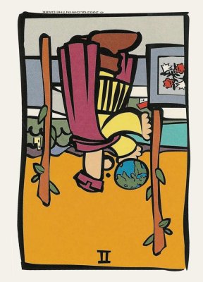 The 2 of Wands represents the research and digestion of a new idea. The number of this card and it's element are somewhat in conflict; while the 2 is focussed inwards, the Wand's element fire is outgoing. Fire wants to steam ahead while the blackbox 2 asks for patience.