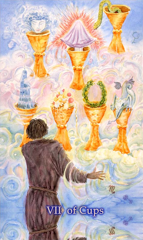 The 7 of Cups is about making a choice between different ideals. But Cups, with the water element, don't like making definitive choices that much, making this 7 in this suit a bit of a hard choice.