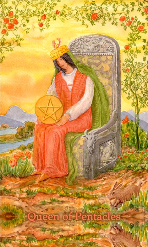 The Queen in the suit of Pentacles becomes aware of her Earthly attributes; she's reliable and sober, able to give good advice.