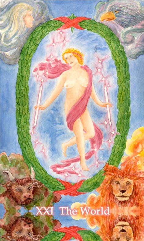 This card falls when you've completed all assignments, overcome all obstacles and are completely at peace with yourself due to your accomplishments. Yet Tarot wouldn't be Tarot if it didn't challenge you to enter entirely new worlds and start the process all over again.