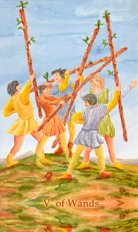 The 5 of Wands represents competition. The 5 is the second assignment number, and therefore a difficult card. 5 combined with the Wand's element fire challenges you. You'll have to fight hard for your idea, but you stand a good chance of succeeding.