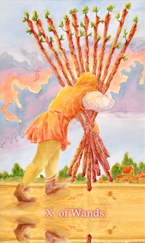 The 10 of Wands is therefore the transition from the element Fire (associated with Wands) to the element Water, associated with Cups. As you might imagine, this not the easiest of transitions.
