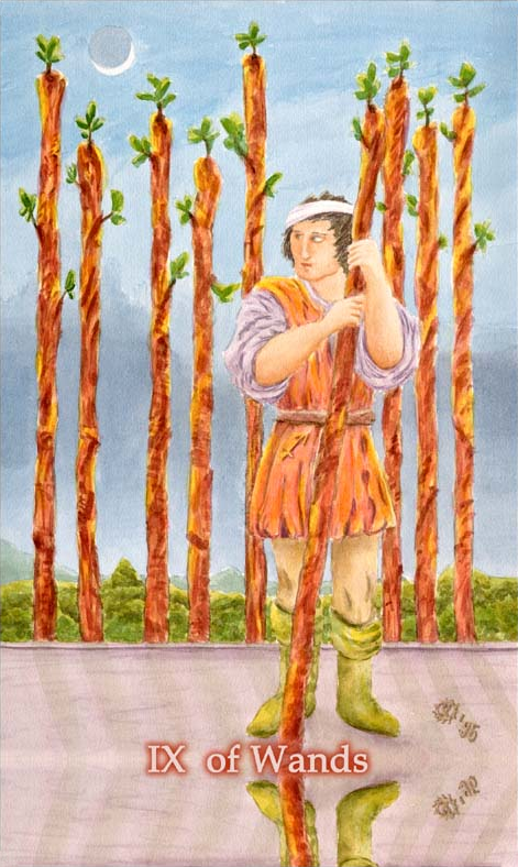 The 9 represents rest after work, which is another thing (like 8) that the element Fire associated with Wands is not very comfortable with. Fire likes to keep going. This rest will probably be spent thinking about what to do next along the course to completion.