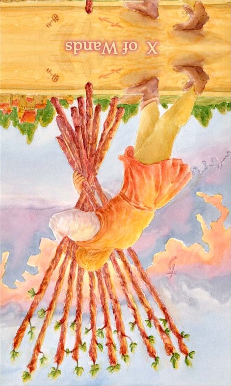 The 10 of Wands is therefore the transition from the element Fire (associated with Wands) to the element Water, associated with Cups. As you might imagine, this not the easiest of transitions.