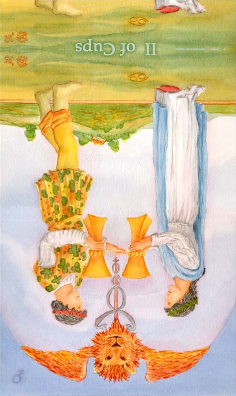 This the first assignment number of the Cups suit. Unlike Wands, with the Fire element, Cups, with the water element, has a lot more patience. Water is by nature more introspective, and this second card in the Cups suit is indeed about exploring yourself. The outcome is uncertain as always, but it usually results in better acceptance of yourself.