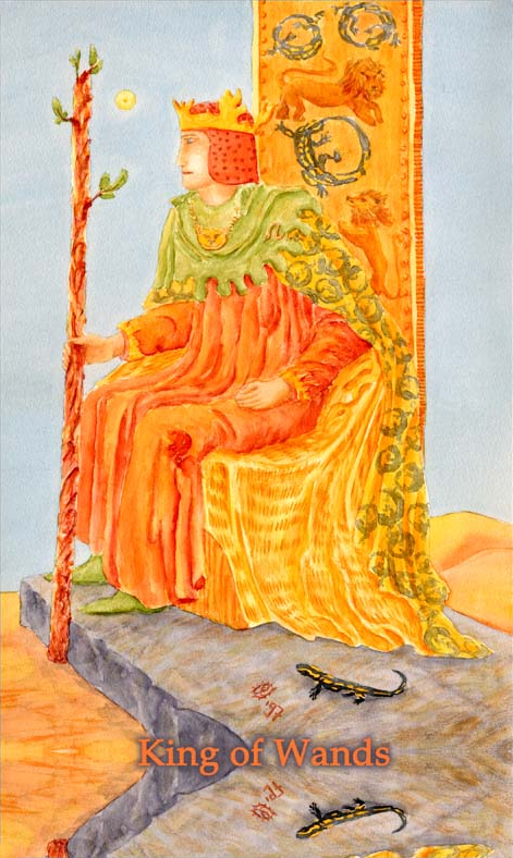 The King of Wands uses the properties of Wands (vitality, optimism, enthousiasm) to go out with confidence. He is seen as a leader with charisma.