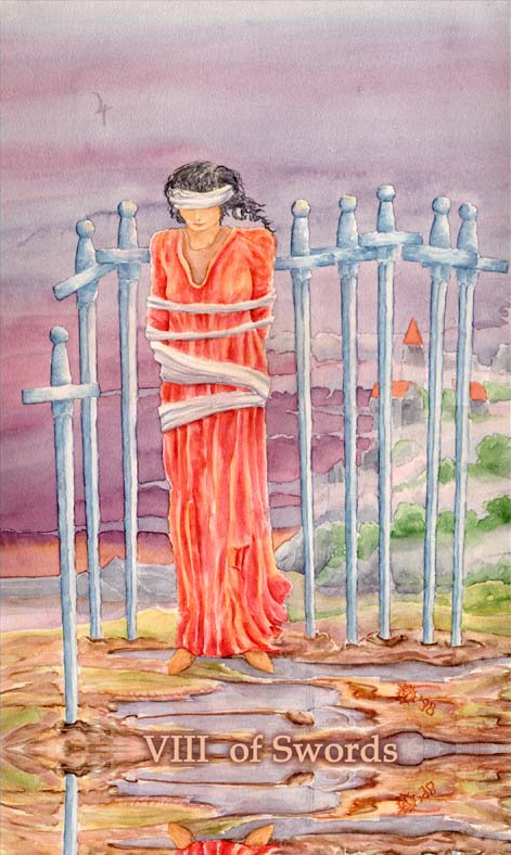 The 8 of Swords is about slowly regaining strength and energy. The 8 is an assignment number, and in the element of Swords it's a bit harder than usual.