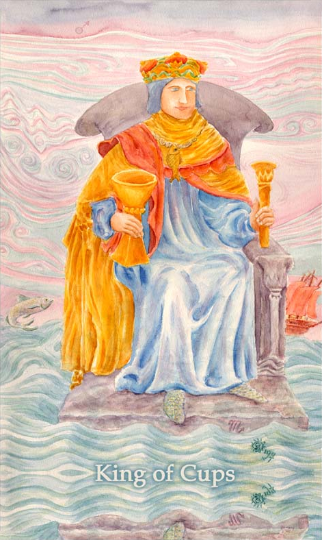 The King of Cups uses his intuition to achieve his ideals. Since Cups are turned inward, and Kings turned to the outside world, this card might be a difficult one, or it could be a powerful one.