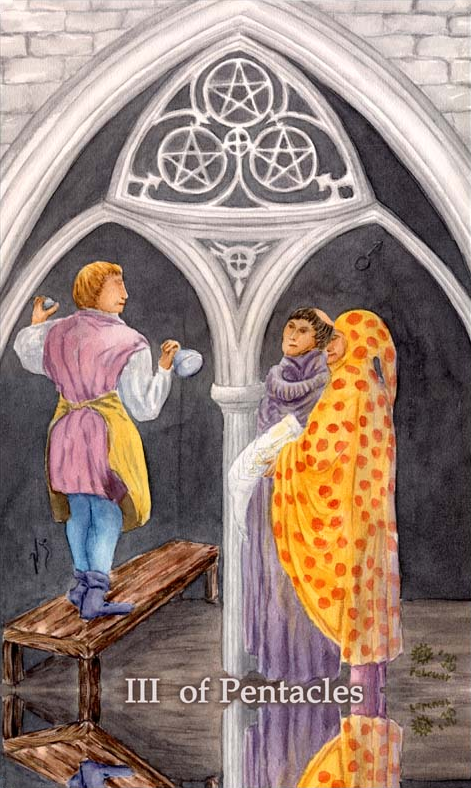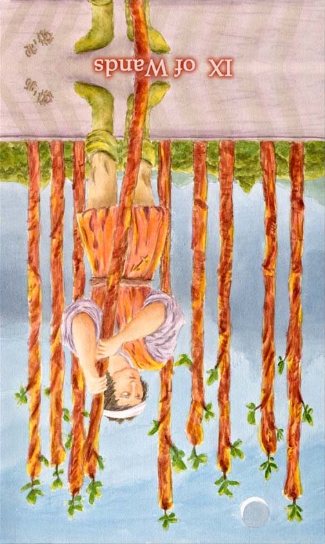 The 9 represents rest after work, which is another thing (like 8) that the element Fire associated with Wands is not very comfortable with. Fire likes to keep going. This rest will probably be spent thinking about what to do next along the course to completion.