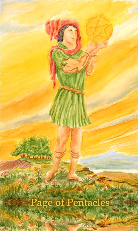 Pages explore and gather information about the road ahead, with an almost naive attitude. The Page of Pentacles is sometimes described as a bridge builder; Pentacles is the suit where the actual work is done, and the Page here enables those that follow to quickly cross difficult terrain.