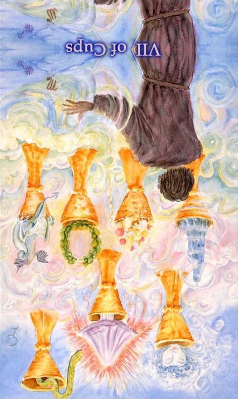The 7 of Cups is about making a choice between different ideals. But Cups, with the water element, don't like making definitive choices that much, making this 7 in this suit a bit of a hard choice.