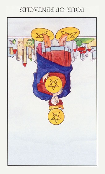 The 4 of Pentacles is about holding on to what you got. The number 4 represents structure and order, and fits well with the suit's element, Earth.