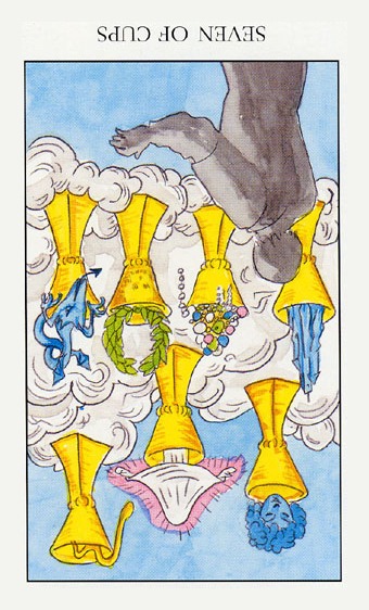 The 7 of Cups is about making a choice between different ideals. But Cups, with the water element, don't like making definitive choices that much, making this 7 in this suit a bit of a hard choice.