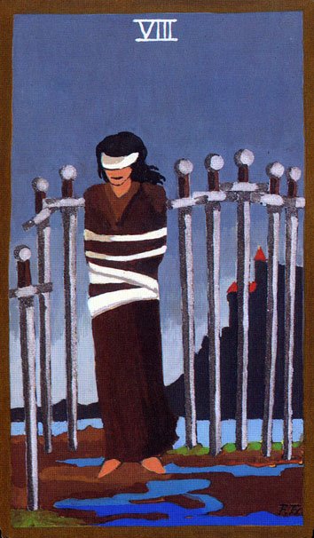 The 8 of Swords is about slowly regaining strength and energy. The 8 is an assignment number, and in the element of Swords it's a bit harder than usual.