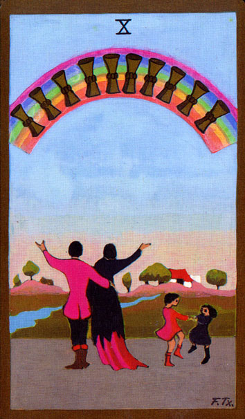 The 10 of Cups is the link to the Swords suit. It is time to leave your own emotions behind and face the world and the tasks ahead.