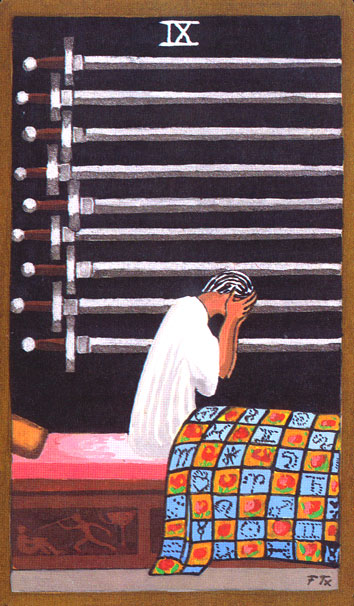 The 9 of Swords represents relief from cropped-up grief. The number 9 is a number of reward and rest and accomplishment. In the element of Swords there is not a lot of time for rest, but without any rest you'd just burn yourself out.