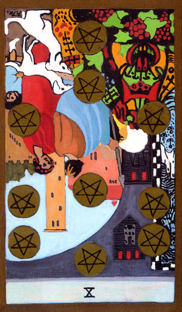 The 10 of Pentacles represents material posessions. The number 10 of Pentacles forms the links to the Ace (first card) of Wands (the first suit in the minor Arcana), and thus prepares to bring you back to the beginning of the minor Arcana, ready for a next cycle through the tarot.