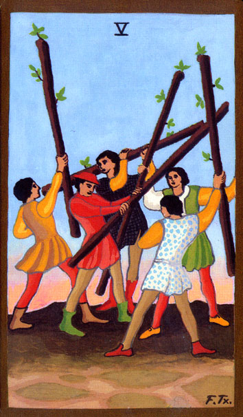 The 5 of Wands represents competition. The 5 is the second assignment number, and therefore a difficult card. 5 combined with the Wand's element fire challenges you. You'll have to fight hard for your idea, but you stand a good chance of succeeding.