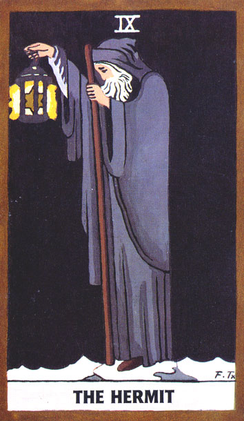 The Hermit carries the number 9. This is the highest base number. After 9 the composed numbers emerge. Therefore the number 9 is the gateway to a higher order. It is also a place to rest before embarking on the next leg of the journey.