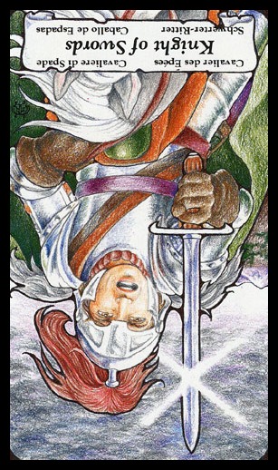 The Knight of Swords lacks the naivety of the Knight of Wands, he has analyzed the terrain ahead and weighed his options there. He knows what his own nature can throw into the mix, but does not let himself be held idle by that. The activities ahead will likely include the solving of conflicts and problems on your road to your ideal.