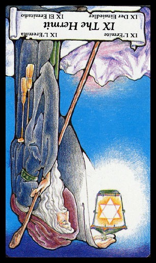 The Hermit carries the number 9. This is the highest base number. After 9 the composed numbers emerge. Therefore the number 9 is the gateway to a higher order. It is also a place to rest before embarking on the next leg of the journey.