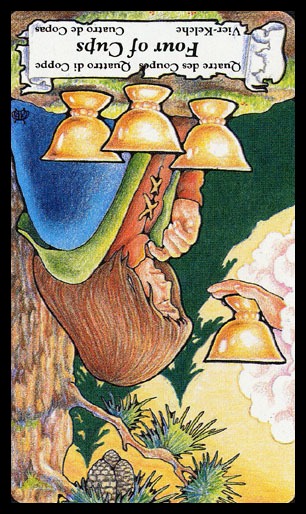 With the 4, the second cycle of this suit is commenced, where a choice between structure and feeling has to be made, where old securities have to be let go of to work towards a new future. But like Wands, Cups don't like structure much, they prefer to be free and dream rather than to make commitments and go for something.