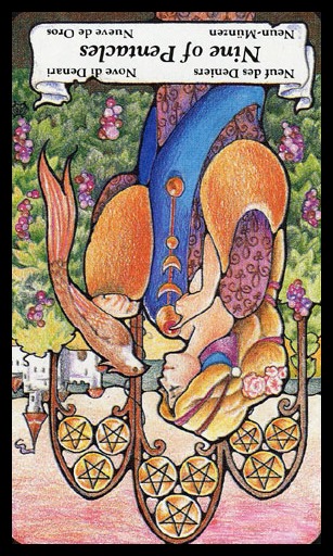 The 9 of Pentacles represents earned rest. The element Earth, attached to the Pentacles suit, appreciates the rest that completion of hard work brings. This is a good time for games and relaxation.