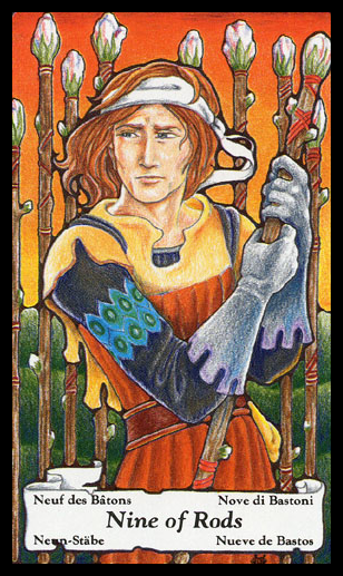 The 9 represents rest after work, which is another thing (like 8) that the element Fire associated with Wands is not very comfortable with. Fire likes to keep going. This rest will probably be spent thinking about what to do next along the course to completion.