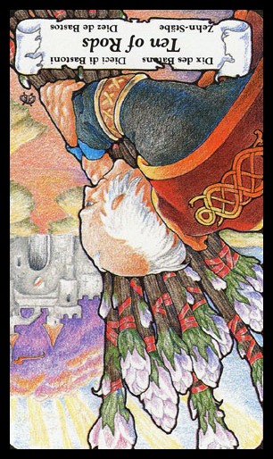 The 10 of Wands is therefore the transition from the element Fire (associated with Wands) to the element Water, associated with Cups. As you might imagine, this not the easiest of transitions.