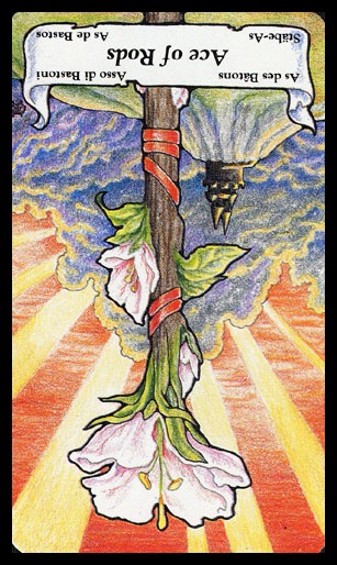The ace of wands represents the beginning of an idea. The element fire and the number 1 give a powerful combination: enterprise and new beginnings apply to both. This is an energetic combination, which is why the card is generally considered a positive one. Spring is the season associated with this card.