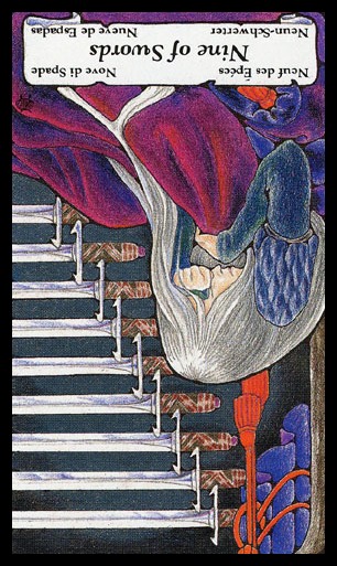 The 9 of Swords represents relief from cropped-up grief. The number 9 is a number of reward and rest and accomplishment. In the element of Swords there is not a lot of time for rest, but without any rest you'd just burn yourself out.